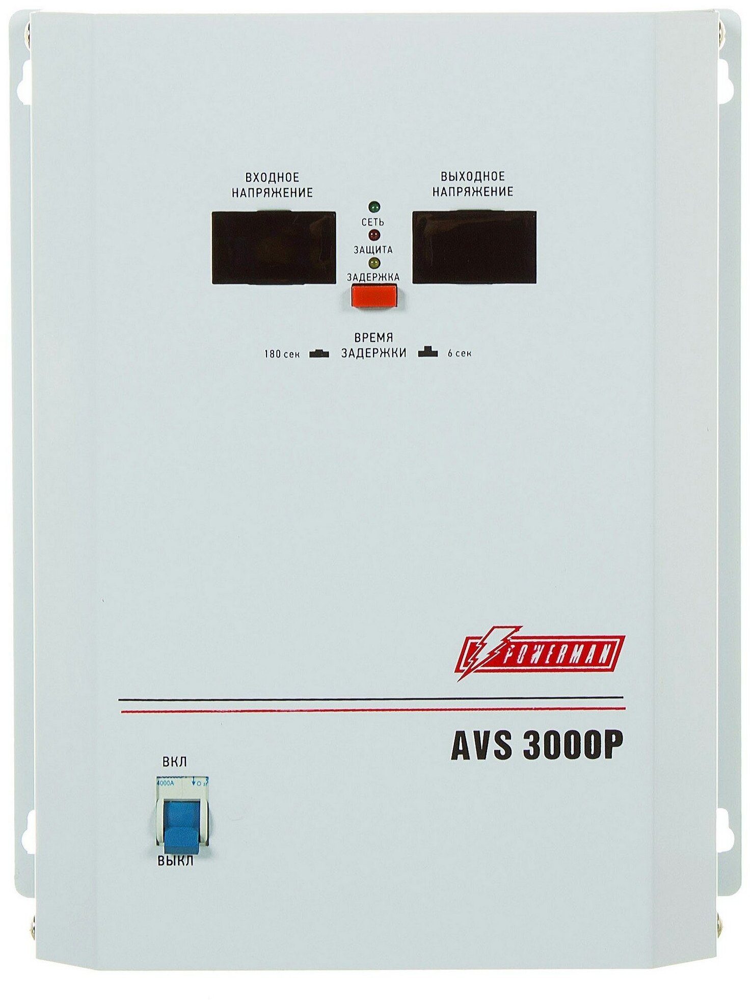 Powerman Стабилизатор POWERMAN AVS 3000P, ступенчатый регулятор, цифровые индикаторы уровней напряжения, 3000ВА, 110-260В, максимальный входной ток 20А, клеммная колодка, IP-20, навесной, 260мм х 220мм х 130мм, 7.2 кг./ Stabilizer POWERMAN AVS 3000P, step