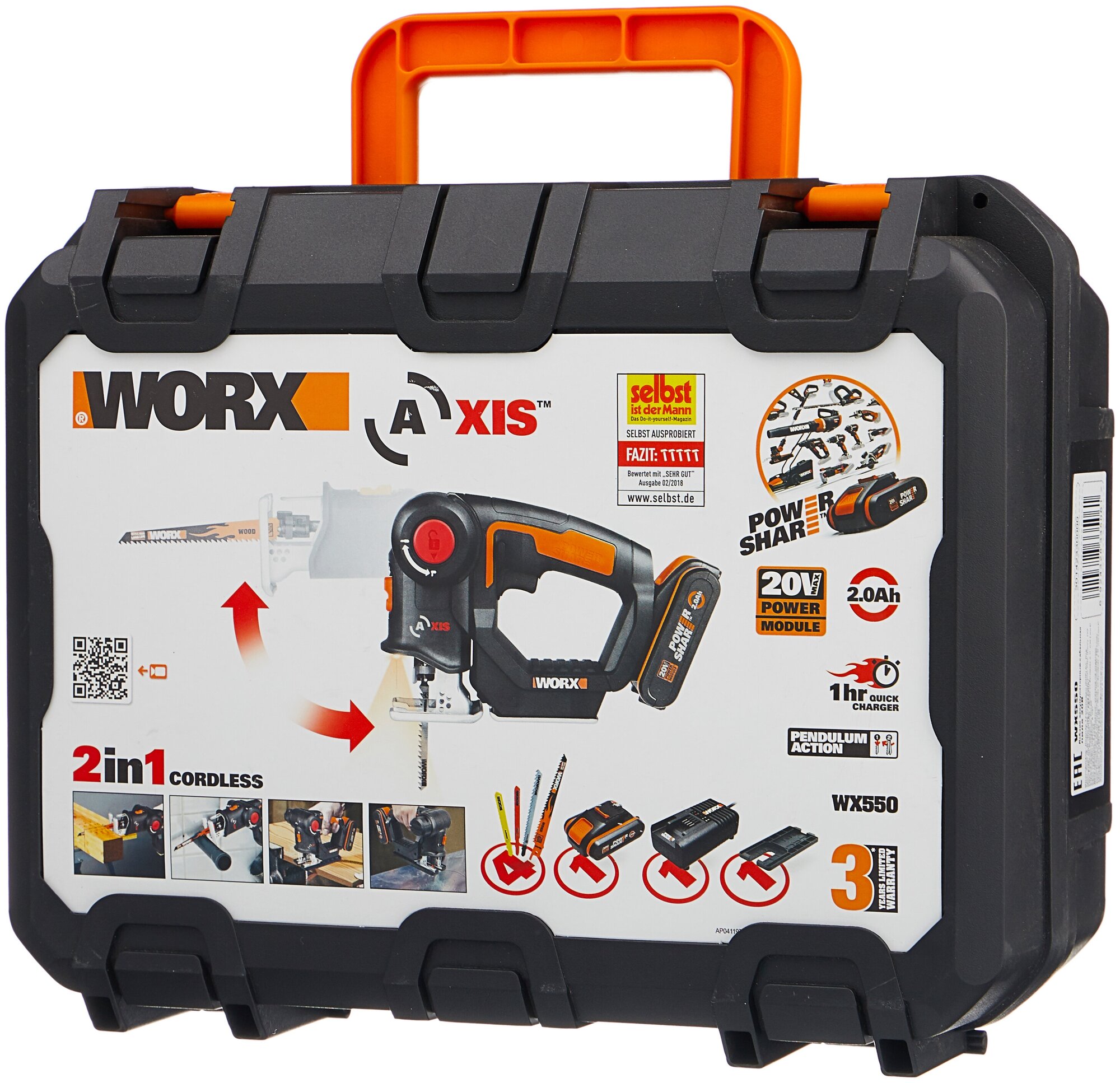 Лобзик акк.-сабельная пила WORX Axis WX550, (Li-lon, 20В, 2.0Ач x1, ЗУ, набор пилок 4 шт, кейс)