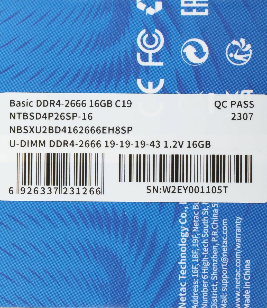 Модуль памяти NETAC Basic NTBSD4P26SP-16 DDR4 - 16ГБ 2666, DIMM, Ret