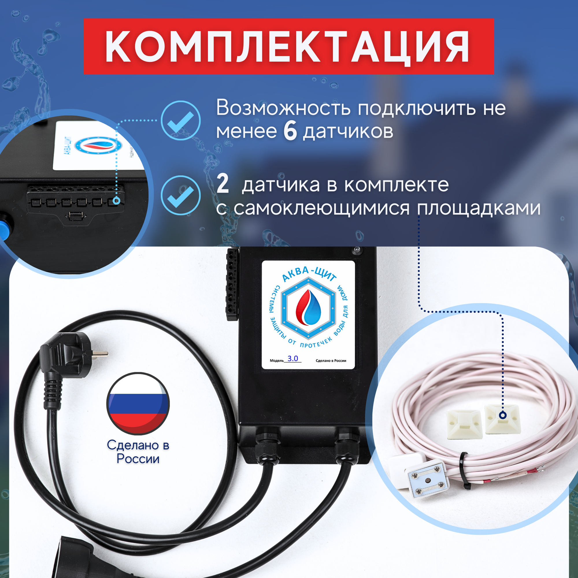 | Подробная комплектация | Блок защиты от протечек, 2 датчика протечки, Инструкция |