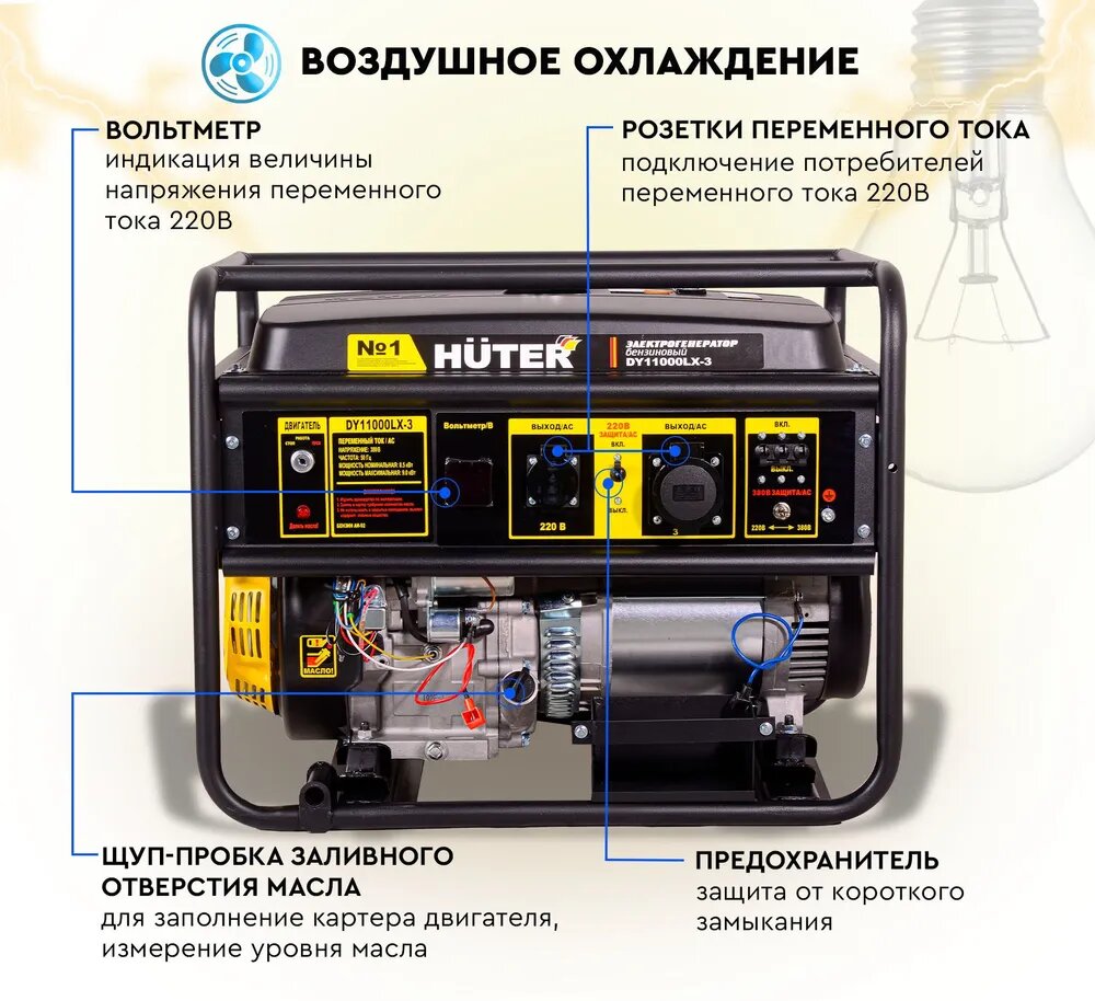 Генератор бензиновый Huter DY11000LX-3, трехфазный, 9 кВт, электростартер