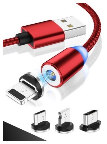 Магнитный USB-кабель для зарядки телефона 3в1 с 3-мя разъемами. Провод с Type-C, Micro-USB и Lightning, красный шнур