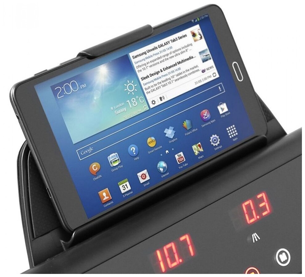 | Особенности | язык интерфейса: английский, 4 буквенно-цифровых дисплеев с сенсорными кнопками управления, спецификация программ: ручной режим, 15 встроенных программ (ходьба, быстрая ходьба, средний бег, бег трусцой, снижение веса, темповая тренировка, разминочный бег, подготовка к марафону, сжигание жира, аэробный бег, развитие скорости, интервальные тренировки, развитие выносливости, легкий бег, фартлек), 1 пульсозависимая программа; воспроизведение аудио файлов, встроенные динамики, Audio IN minijack 3.5 мм. (для аудио устройств), встроенный кардиодатчик на ручке, возможность подключения беспроводного кардиодатчика (поставляется отдельно), подставка под планшет/смартфон, питание от сети 220 В, беговое полотно: 1.8 мм, парафинированная дека, отсеки для аксессуаров, габариты в сложенном состоянии (ДхШхВ): 24 х 77 х 150 см |