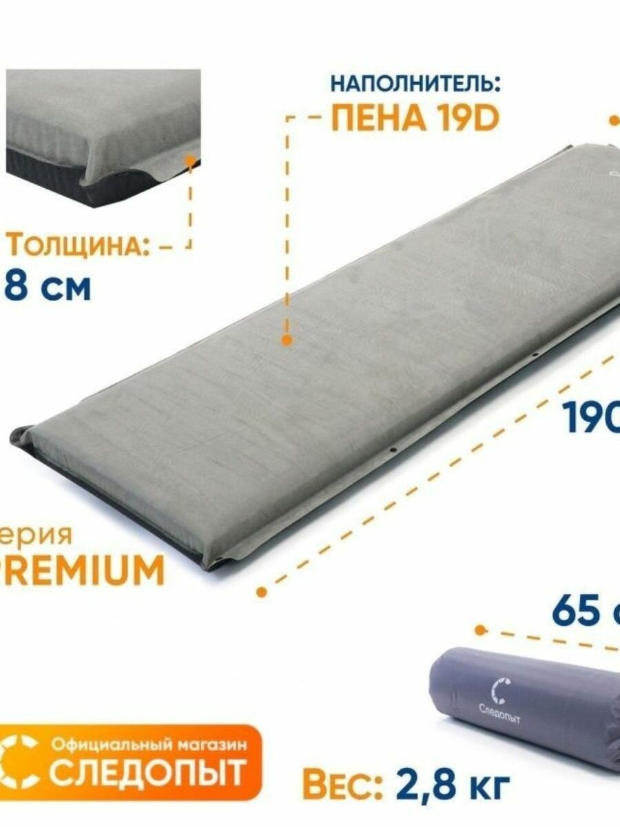 Коврик самонадувающийся следопыт, 190x61x8 cм, премиум, серый