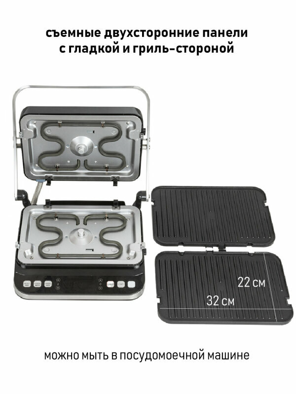 | Особенности | антипригарное покрытие / регулировка высоты верхней панели / поддон для сбора жира / съемные пластины |