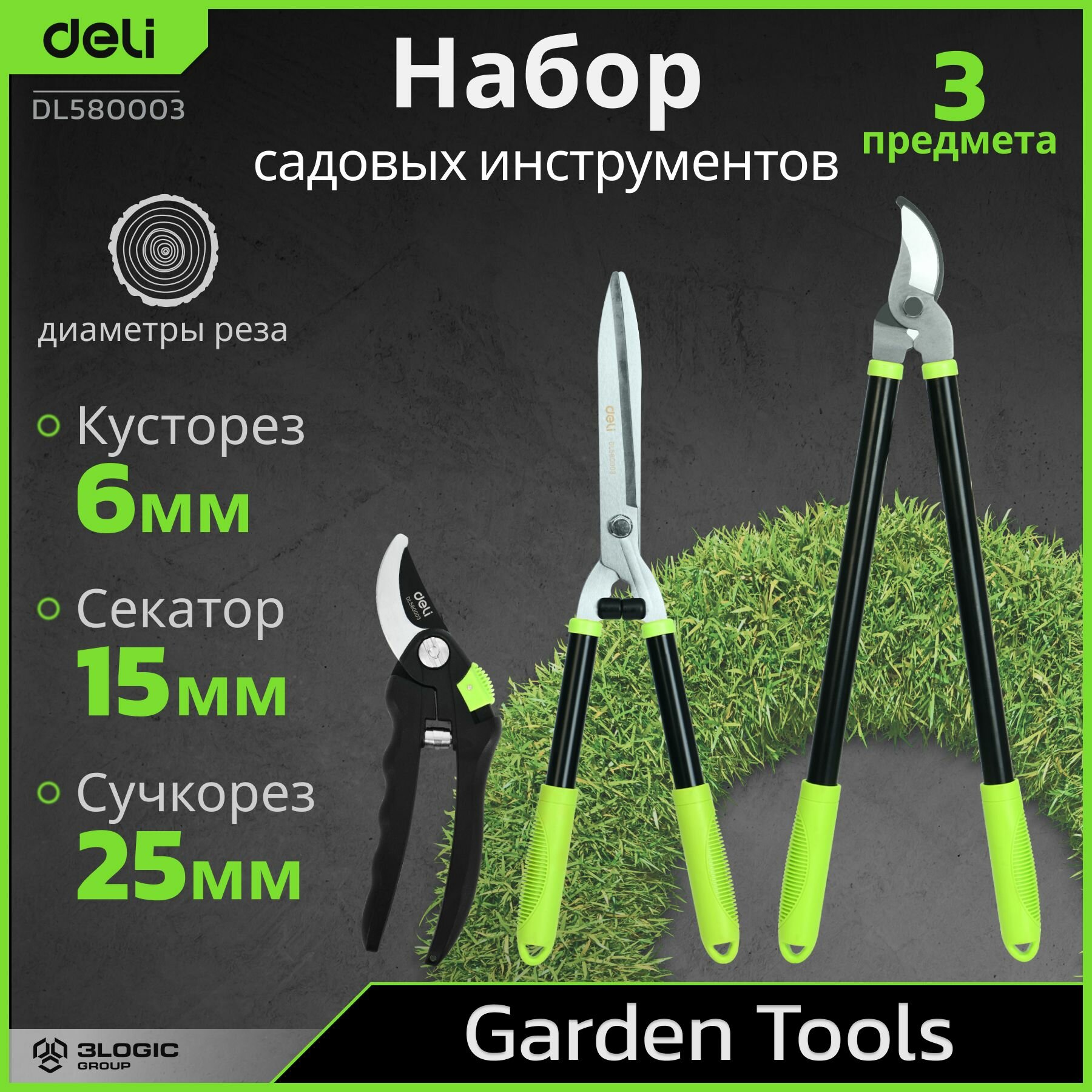Купить Набор для сада и огорода (сучкорез, кусторез, секатор) Deli DL580003 (термообработанная поверхность, противоскользящая рукоять, сталь 55С)