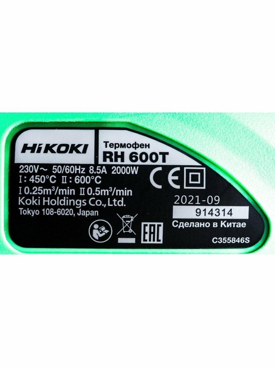 Строительный фен HIKOKI RH600T, 2000 Вт зелeный