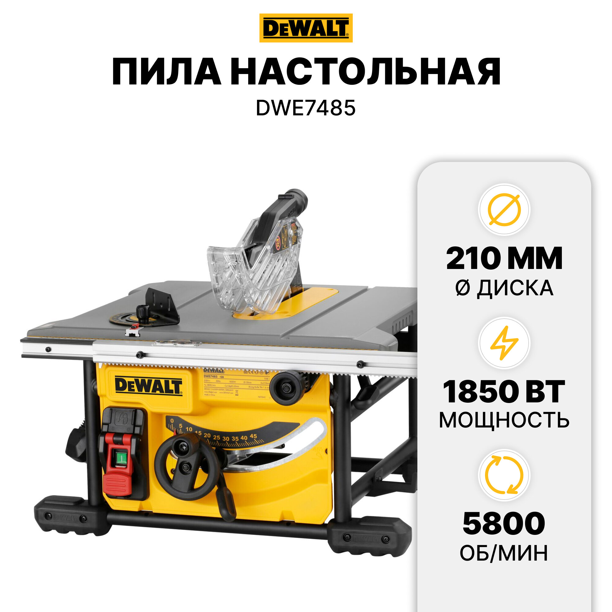 Настольная пила 1850 Вт, 5800 об/мин, диск 210x30 мм Dewalt DWE7485-QS