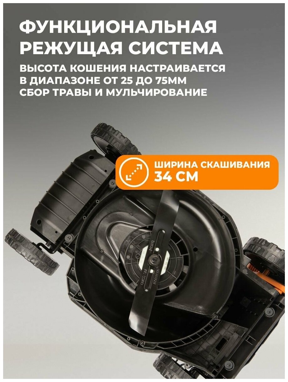 | Минусы: | Иногда налипает трава на режущий нож, что может повредить газонокосилку. Легко решается очисткой. |