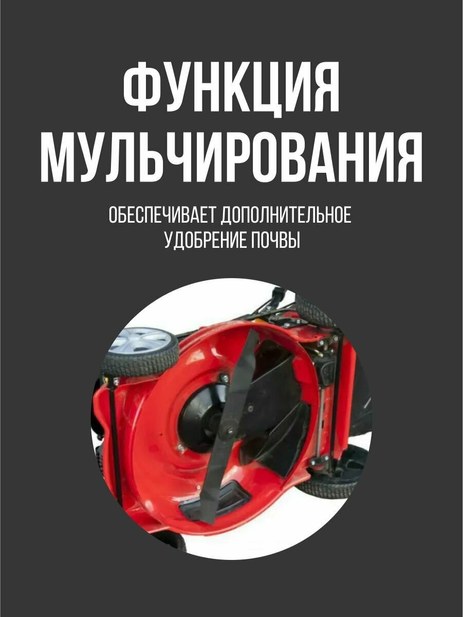 | Дополнительные функции | возможность установки мульчирующей насадки / регулировка высоты скашивания / тормоз двигателя / возможность промывки деки |