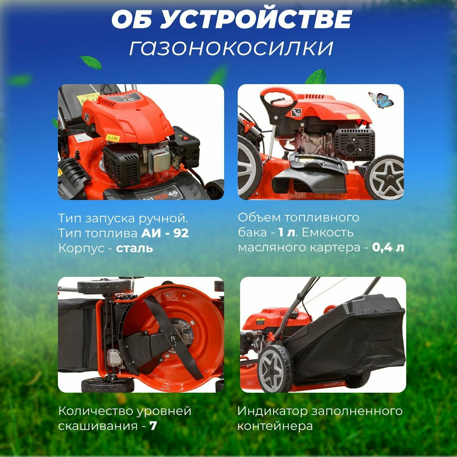 | Особенности | рекомендуемое моторное масло: 4-х тактное полусинтетическое SAE 10W-40 ECO 1 л |