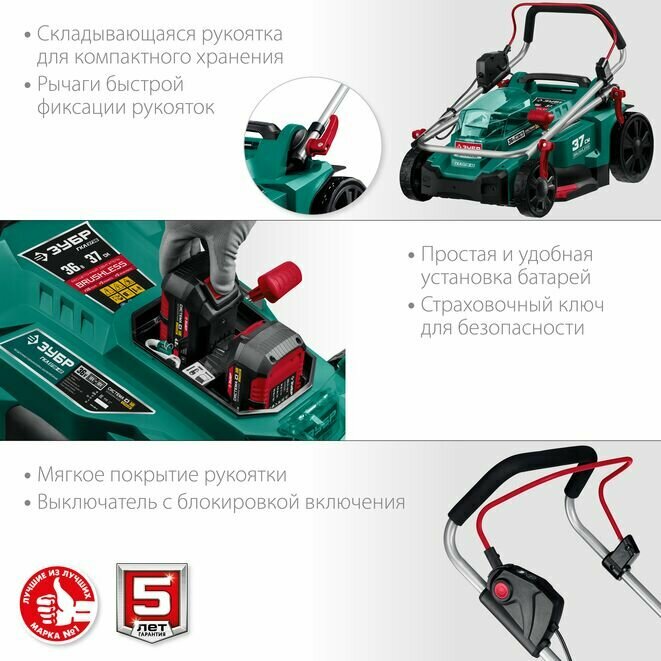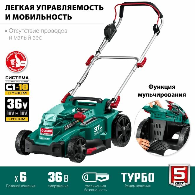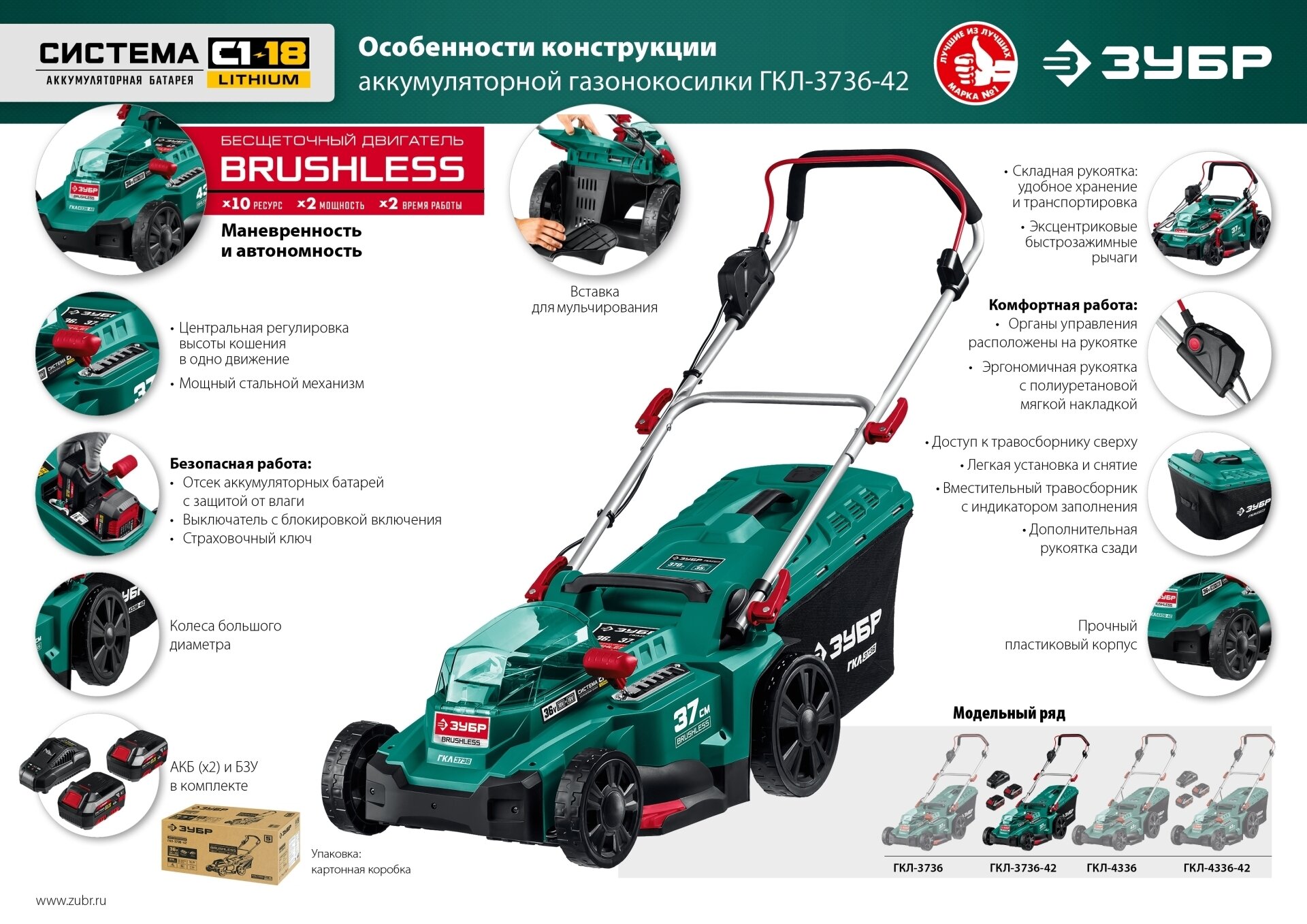 ЗУБР 36В, бесщеточная, 2х18В АКБ (4Ач), газонокосилка ГКЛ-3736-42 Мастер интересное: