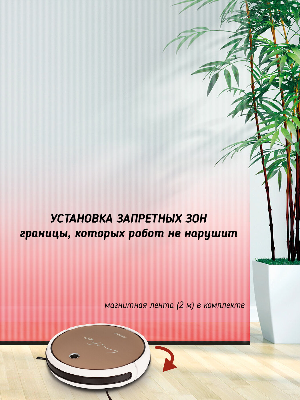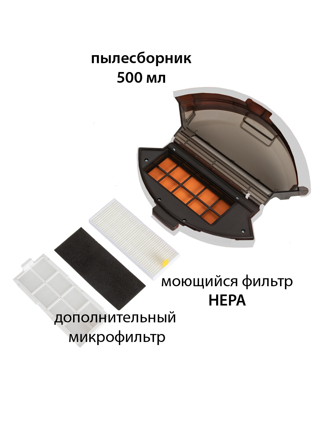 | Дополнительная информация | Голосовое оповещение; голосовой помощник; установка запретных зон (магнитная лента); 4 режима уборки; управление при помощи гироскопа; датчики препятствий и высоты; |