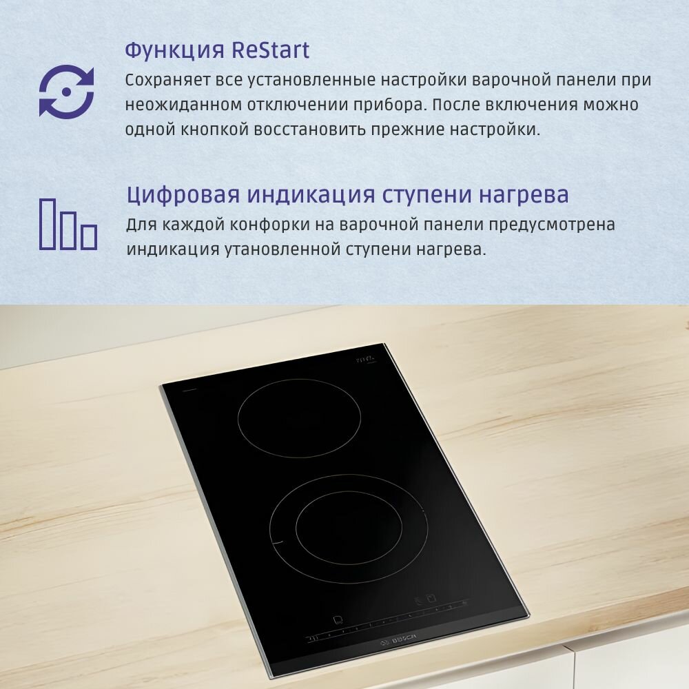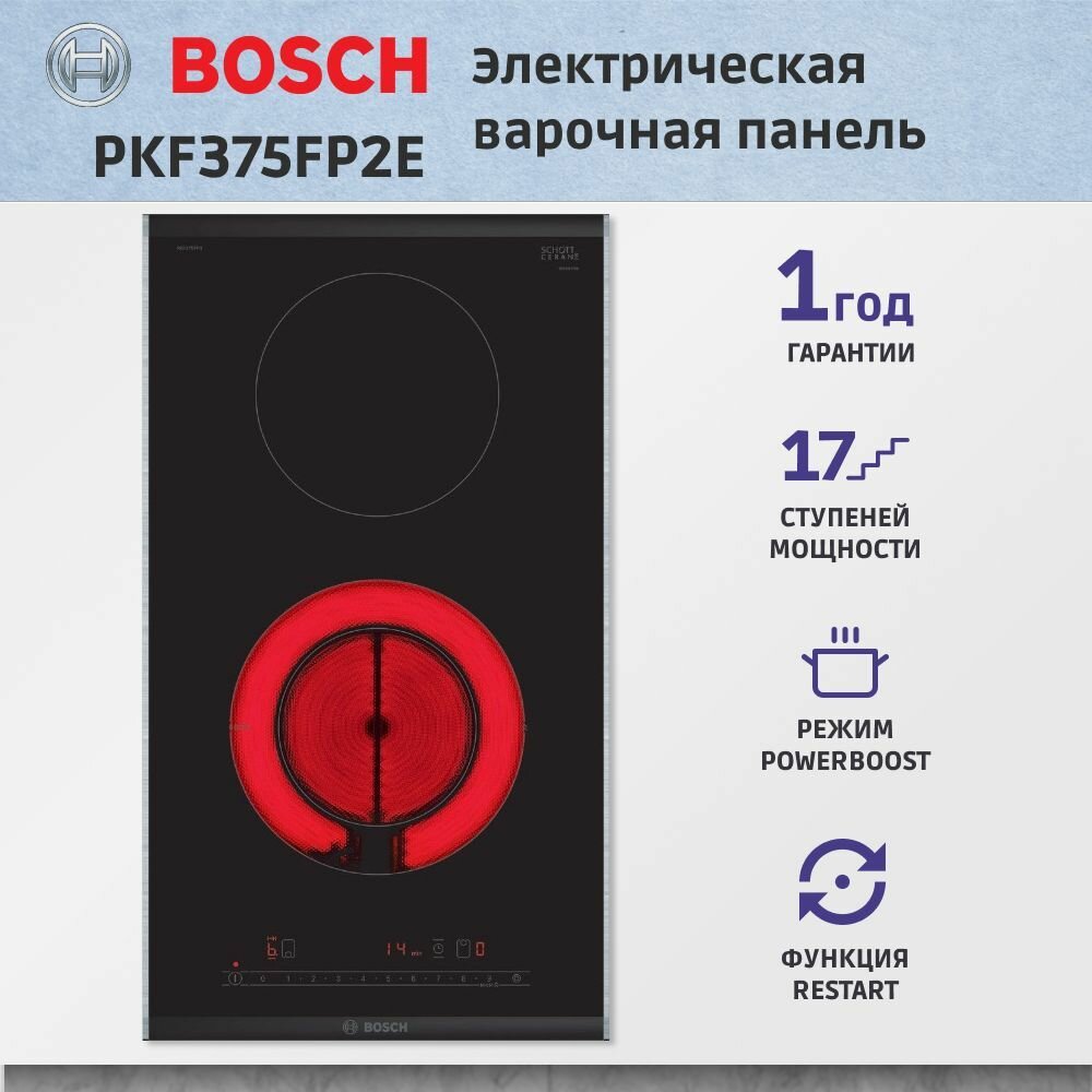 СохранитьЭлектрическая варочная панель Bosch PKF375FP2E, цвет панели черный, цвет рамки серебристый интересное: