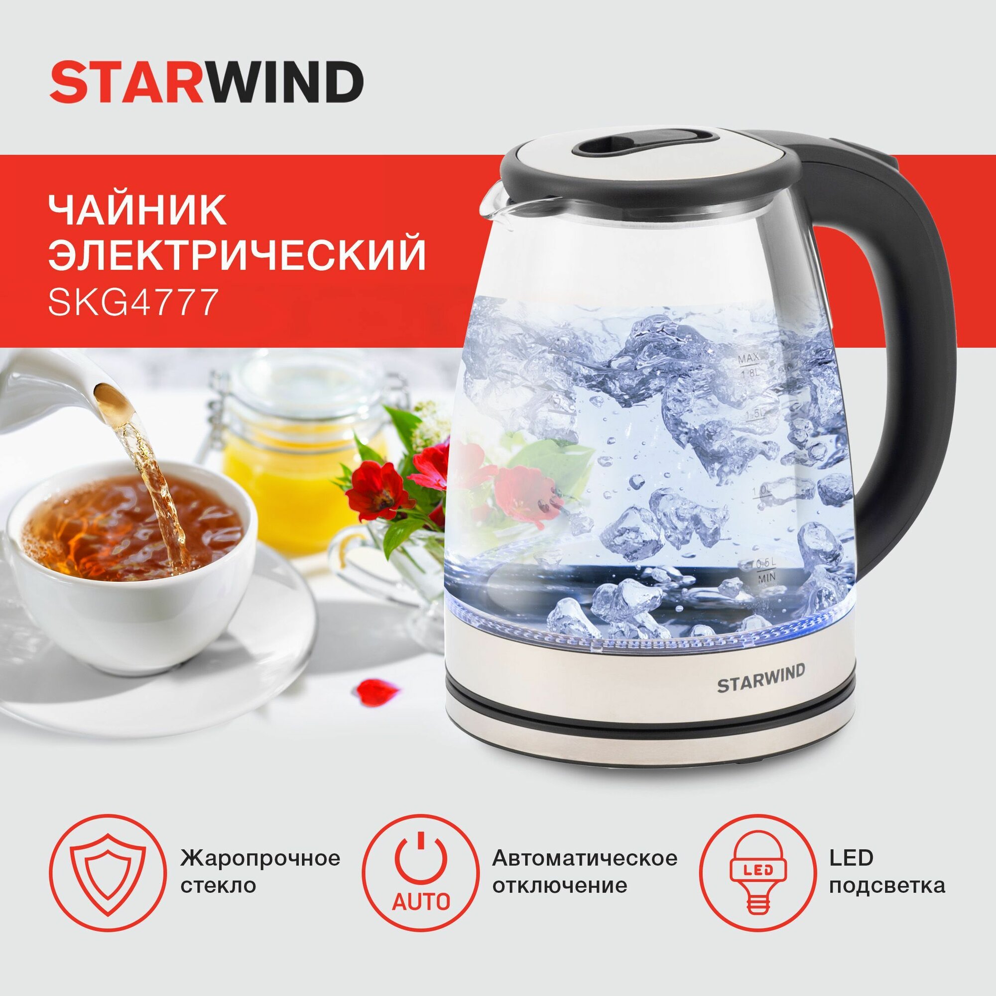 Чайник электрический Starwind SKG4777, черный и прозрачный