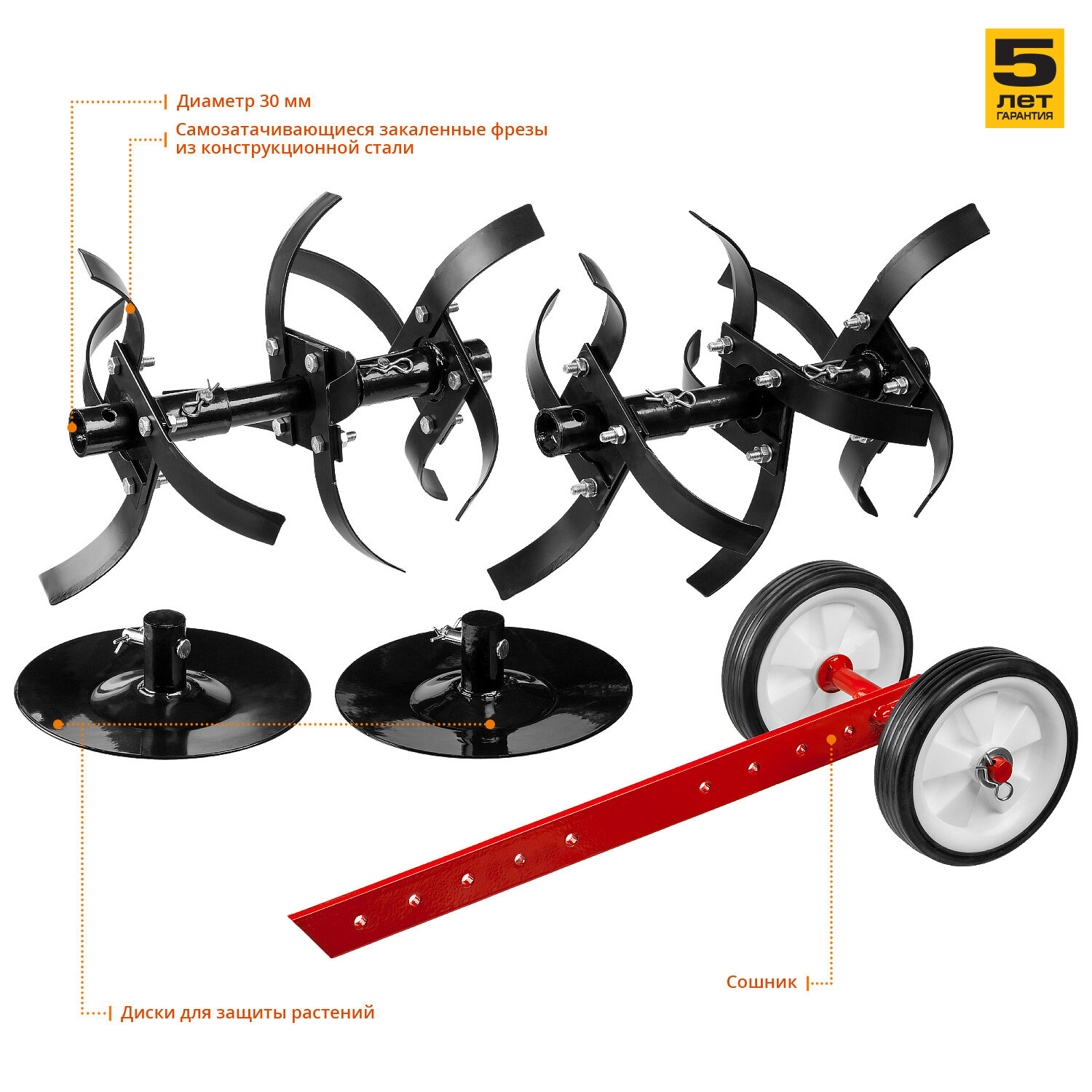 | Комплект поставки | сошник, транспортировочные колеса, крепеж для сборки фрез, хомуты крепления тросов диски защиты растений, комплект ключей |
