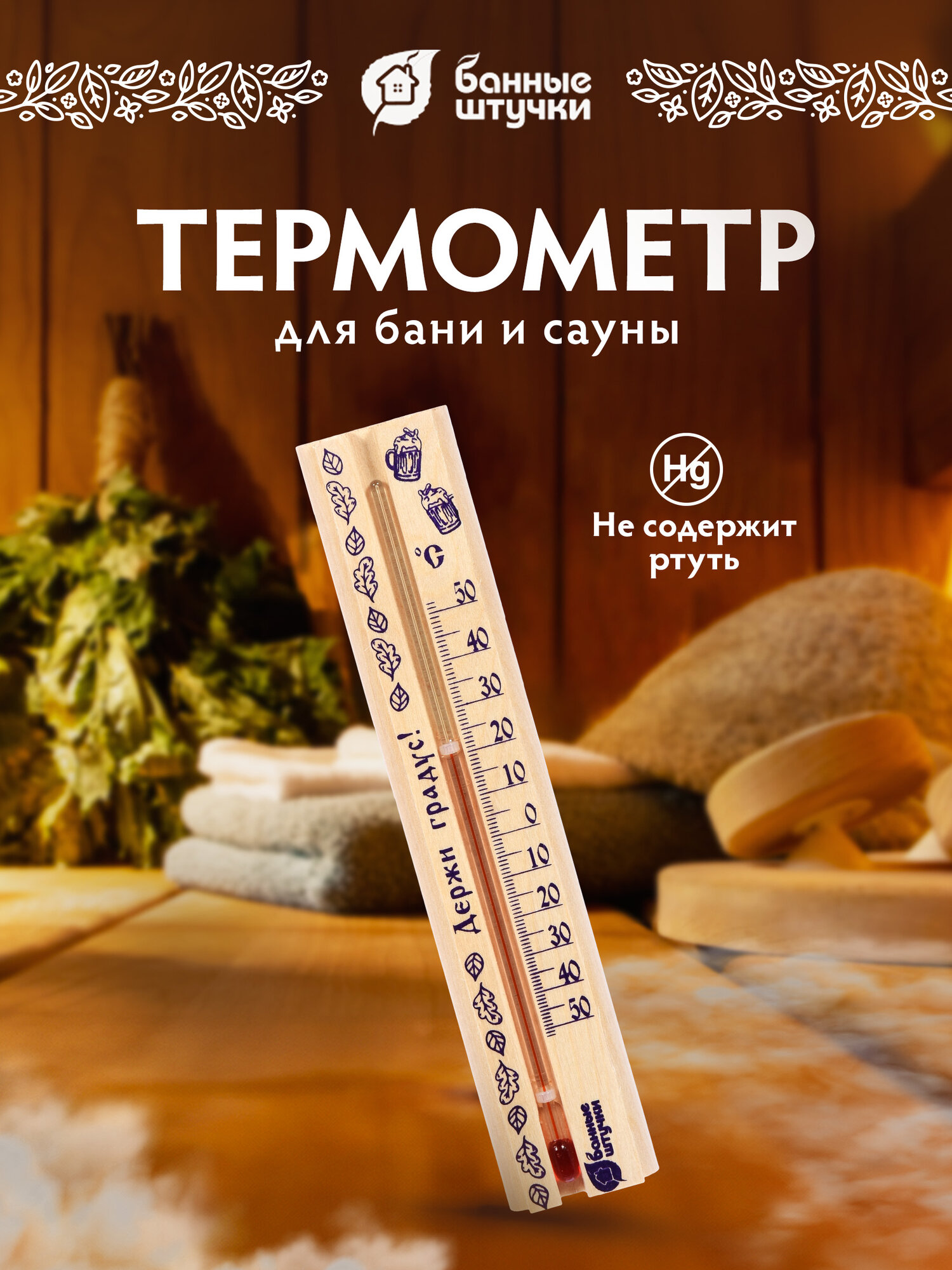 Термометр "Держи градус!" 21x4x1,5 см в предбанник "Банные штучки" дерево/комнатный/настенный/с рисунком интересное: