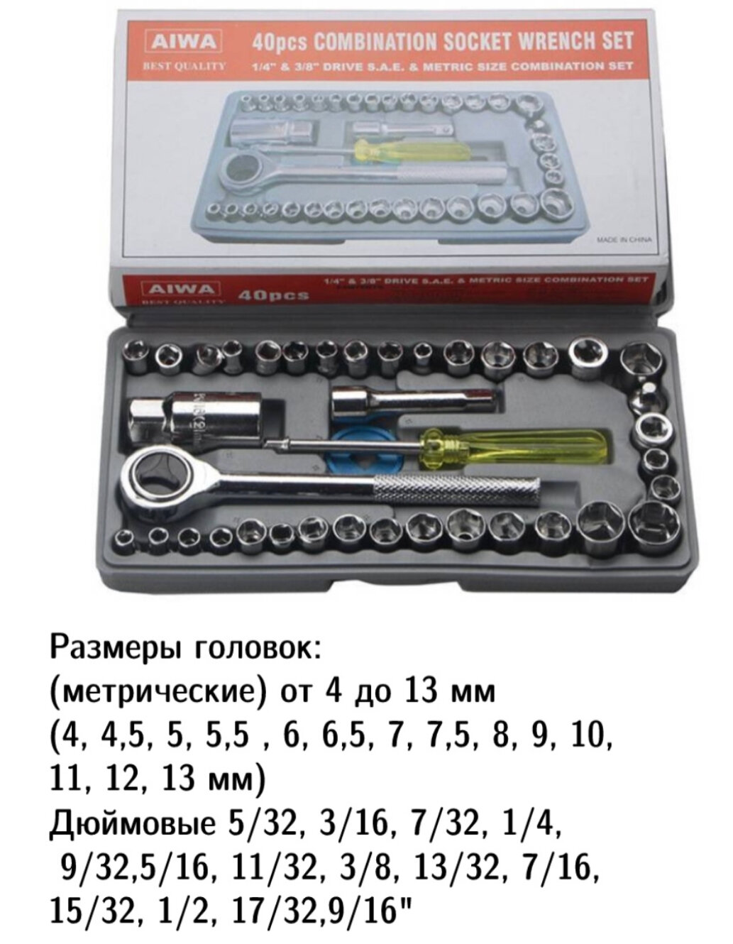 | Головки торцевые подробно | 4, 4,5, 5, 5,5 , 6, 6,5, 7, 7,5, 8, 9, 10, 11, 12, 13 мм) и 5/32, 3/16, 7/32, 1/4, 9/32,5/16, 11/32, 3/8, 13/32, 7/16, 15/32, 1/2, 17/32,9/16". |
