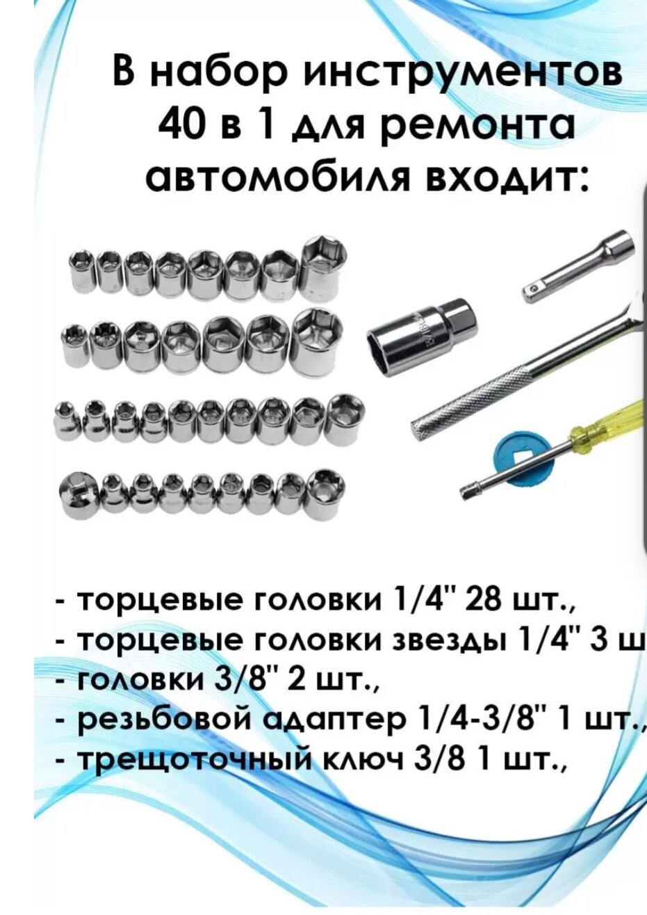 | Плюсы: | набор торцевых головок, 40 предметов, 3/8 дюйма, кейс 24х12х4см. Трещоточный ключ 3/8", удлинитель 7см, головка длинная 21 мм, переходник с 3/8" на 1/4", рукоятка 1/4". 19 головок в метрической системе 2шт 4мм, 4.5мм, 5мм, 5.5мм, 6мм, 6.5мм, 7мм, 7.5мм, 8мм, 2шт 9мм, 2шт 11мм, 12мм, 13мм, 14мм, 15мм, 16мм. 14 головок в дюймах (от 5 мм до 14 мм). |