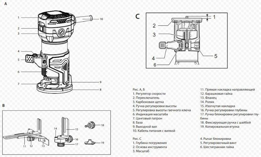| Комплектация | параллельная направляющая, роликовый упор, цанга 6 мм и 8 мм, копировальная втулка, ключи, инструкция |