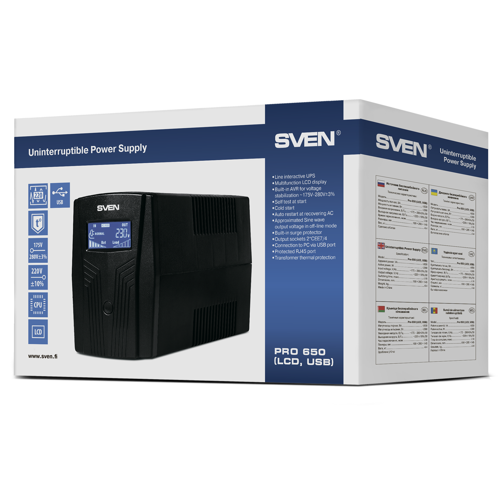 Источник бесперебойного питания Sven PRO 650, 2 розетки, 650ВA, 390Вт, LCD дисплей, черный