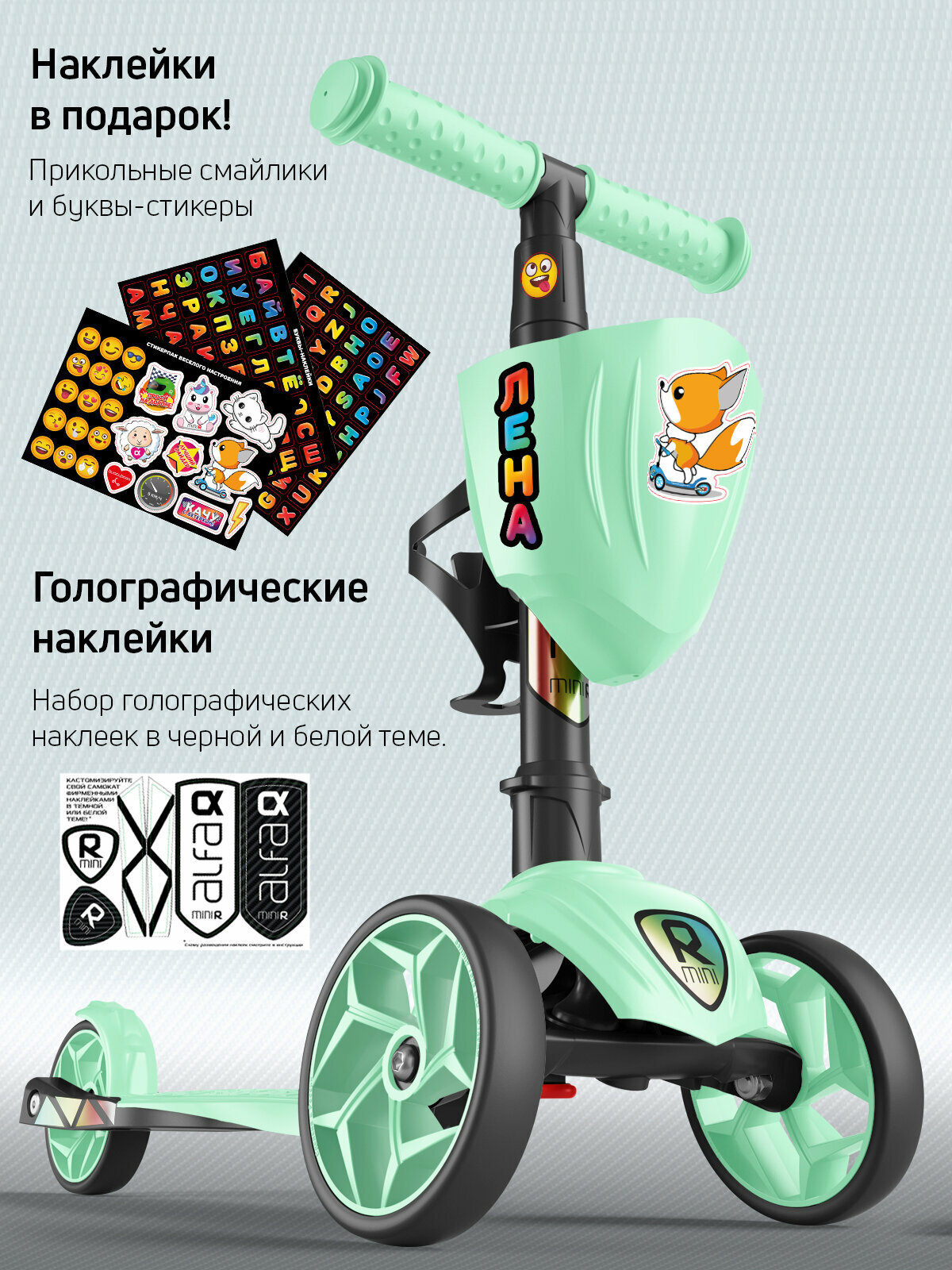 Самокат детский трехколесный с корзинкой, подстаканником для бутылок и наклейками