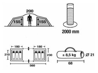 | Габариты внутренней палатки(ДxШxВ) | 180x210x155 cм |