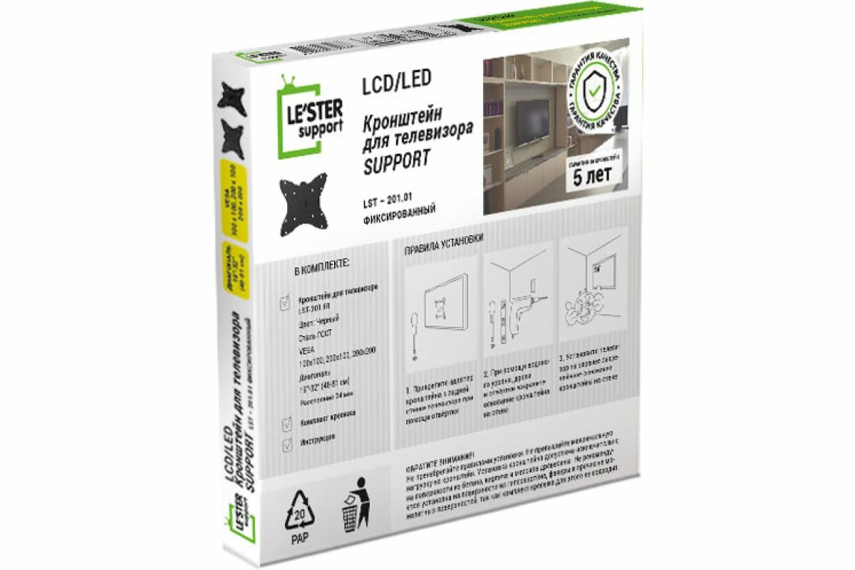 Кронштейн LE'STER LST-201.01 для LCD телевизора от 10" до 55"(25 см - 139 см), фиксированный, нагрузка: 30 кг, Расстояние от стены 24 мм, Стандарт VESA: 100x100, 200x100, 200x200, 100х200