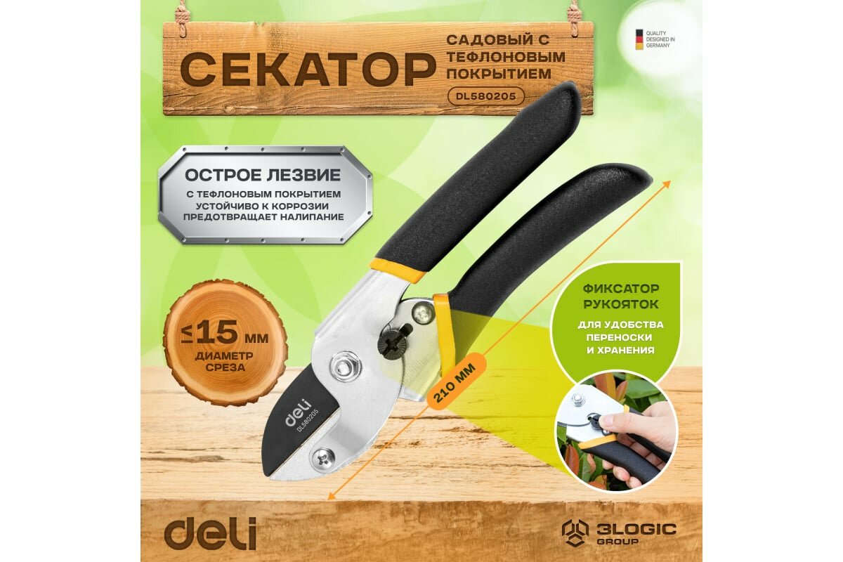DELI Секатор садовый универсальный DL580205 200мм (Сталь 55С, тефлон, диаметр резки 15мм, уплотнённая противоскользящая ручка) 98487