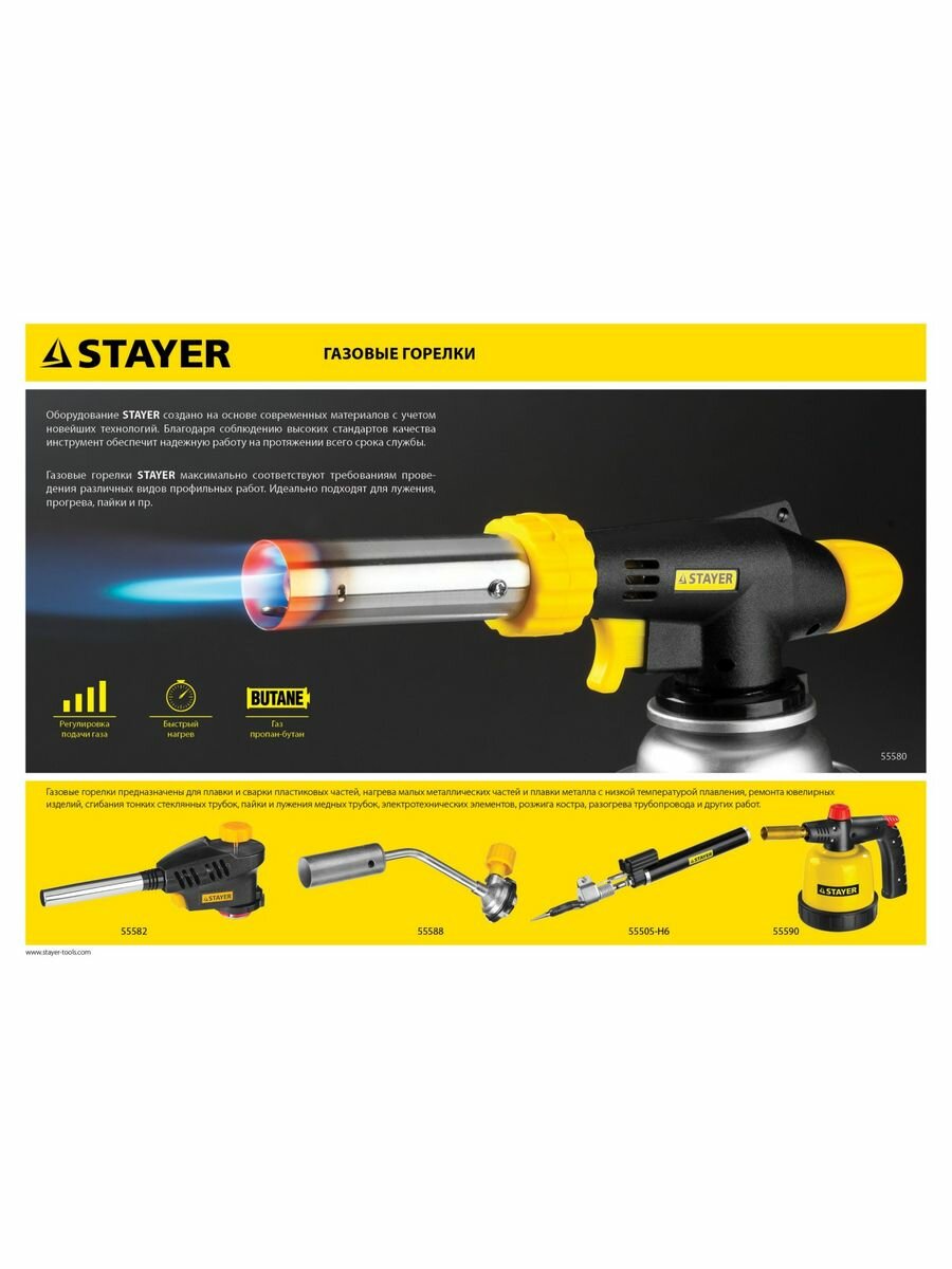 STAYER Паяльная лампа газовая STAYER "MASTER", на баллон, с пьезоподжигом, регулировка пламени, 1850С, ( 55590 )
