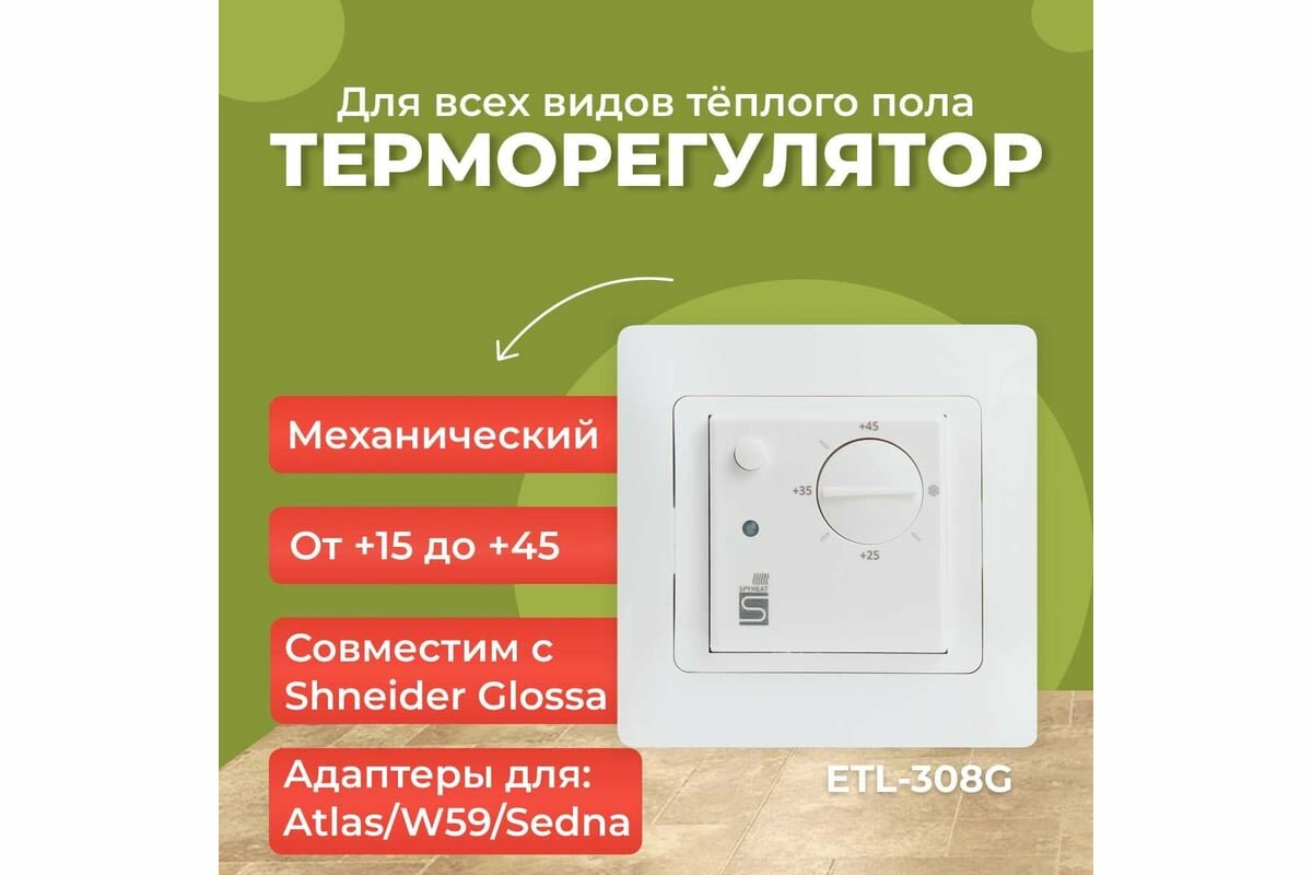 Терморегулятор микропроцессорный электронный SPYHEAT ETL-308G (белый) под рамку Schneider Glossa (с адаптерами под серии Atlas, W59, Sedna)