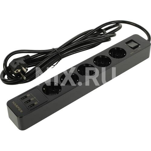 Сетевой фильтр 3.0м черный Harper UCH-560 Black 3xUSB порта, 5 розеток, 4000W 16A