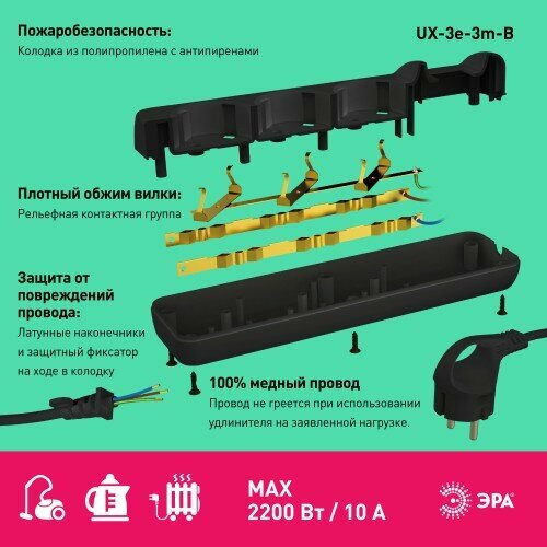 Удлинитель электрический ЭРА UX-3е-3m-B с заземлением 3 розетки 3м ПВС 3х0,75мм2 10А черный (20/5/1) .