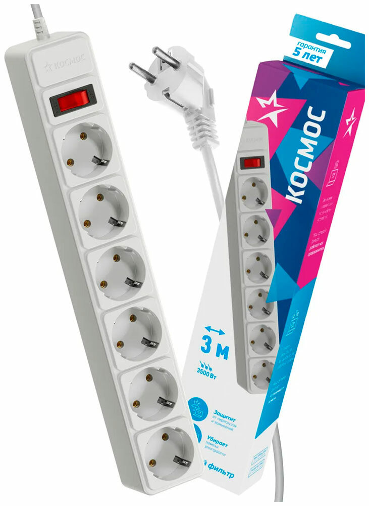 Сетевой фильтр Космос 3м 6 гнезд, белый