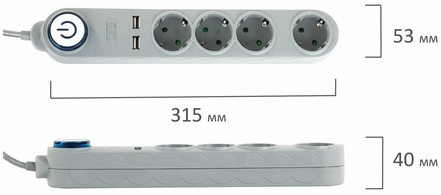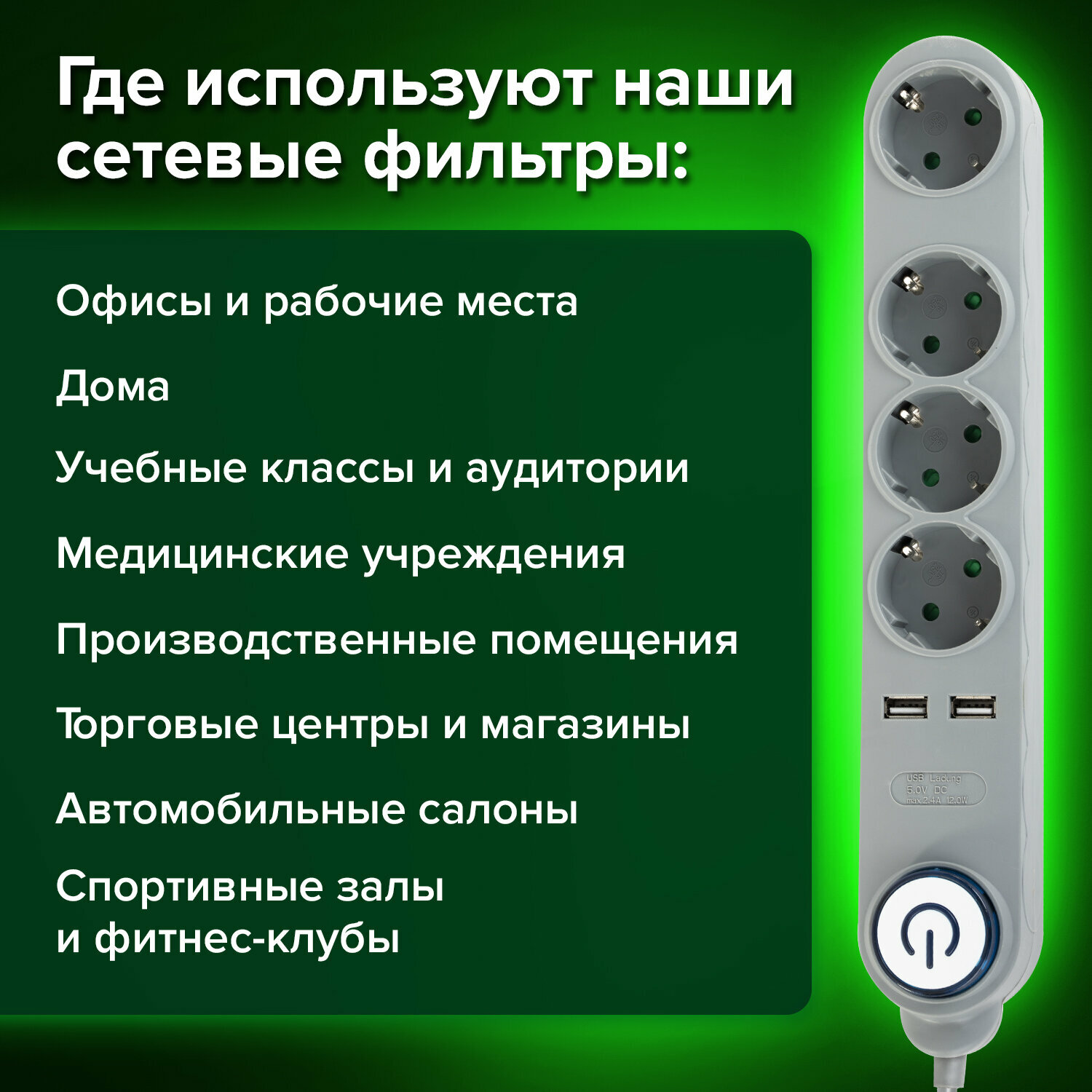 Сетевой фильтр SONNEN DX04, 4 розетки, 2 USB-порта, с заземлением, 10 А, 1,5 м, графит, 513493, 513493
