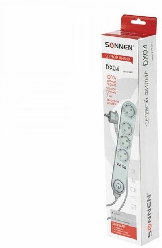 Сетевой фильтр SONNEN DX04, 4 розетки, 2 USB-порта, с заземлением, 10 А, 1,5 м, графит, 513493 В комплекте: 1шт.