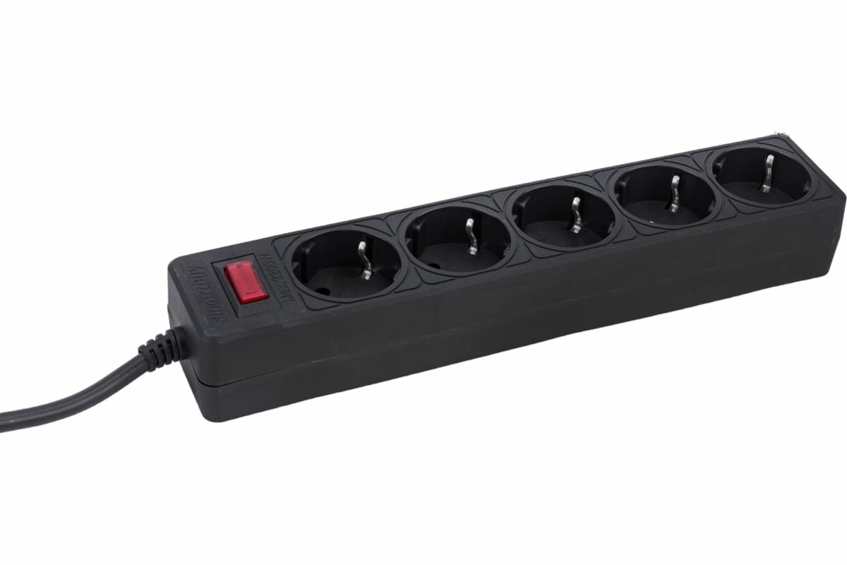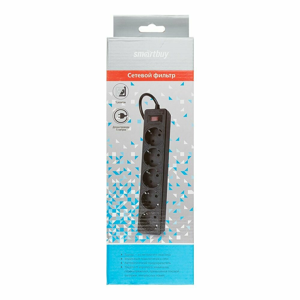 Купить Сетевой фильтр Smartbuy, 10А, 2200 Вт, 5 гнезд, без з/ш, земля, ПВС 3x0,75, 5 м., черный