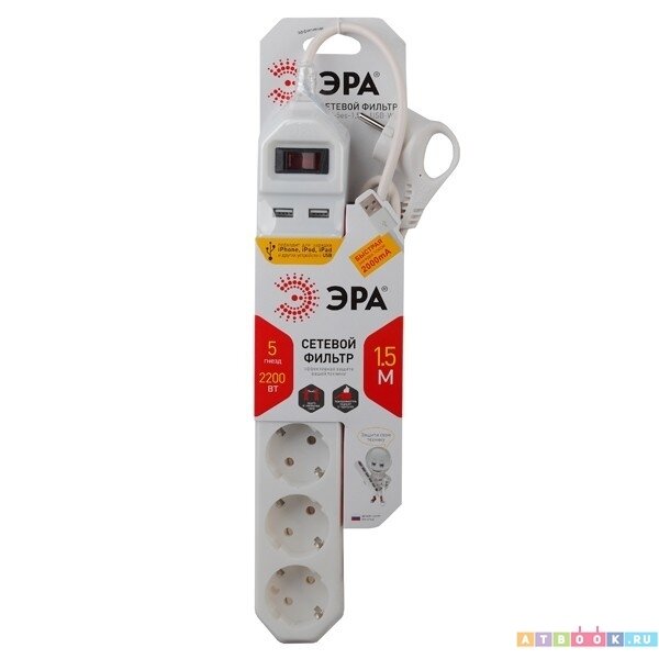 Сетевой фильтр ЭРА USF-5es-1.5m-W с базовой защитой с заземл. с выкл. 5 розеток 1,5м 10А белый