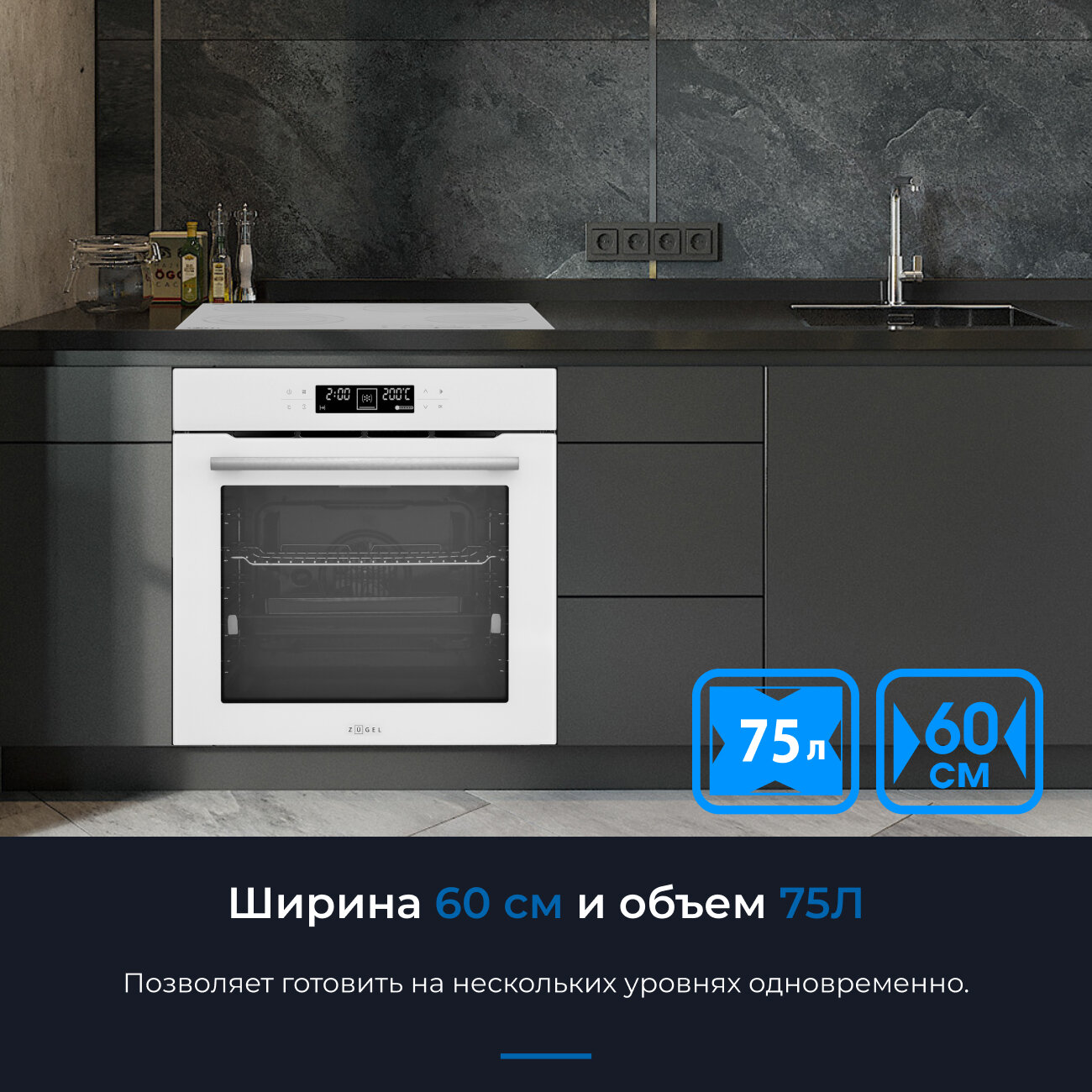Встраиваемый электрический духовой шкаф ZUGEL ZOE601B, 75 л, с LED-дисплеем, 9 режимами работы, 3D-нагревом, конвекцией, грилем, черный