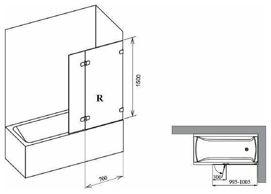 Шторка на ванну Aquanet Practic AE10-B-165H150U-CP, прозрачное стекло