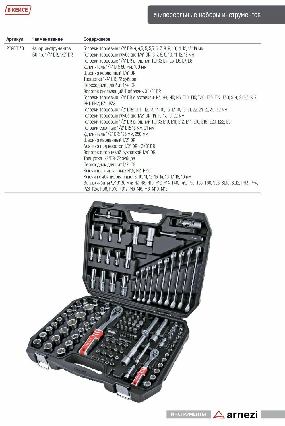 Купить Набор инструментов 130 предметов 1/4DR, 1/2DR ARNEZI R0900130