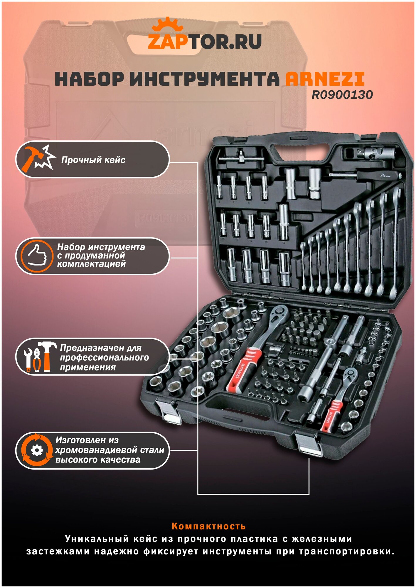 СохранитьНабор инструментов 130 предметов 1/4DR, 1/2DR ARNEZI R0900130 интересное: