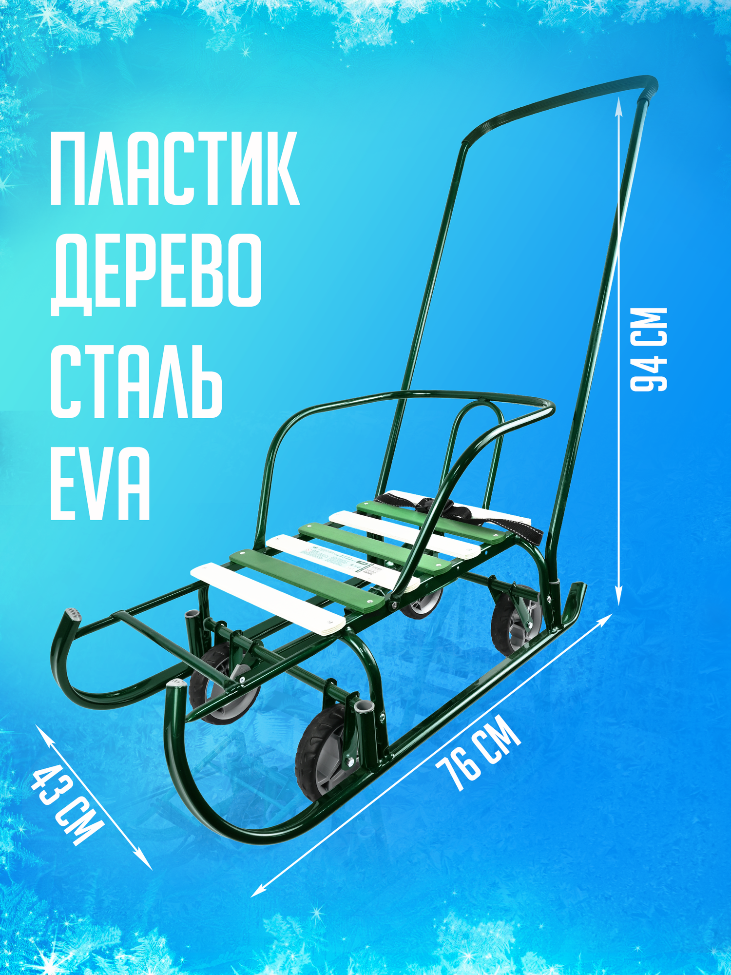Санки Тимка 6 Универсал зеленый лак с 4-я колесами (спинка и ручка) Т6У/З