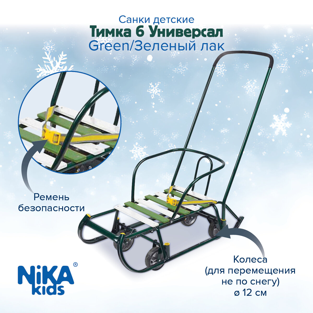 Санки Ника детям "Тимка-6 Универсал", цвет зеленый лак, с колесами, ремень безопасности (Т6У/З2)