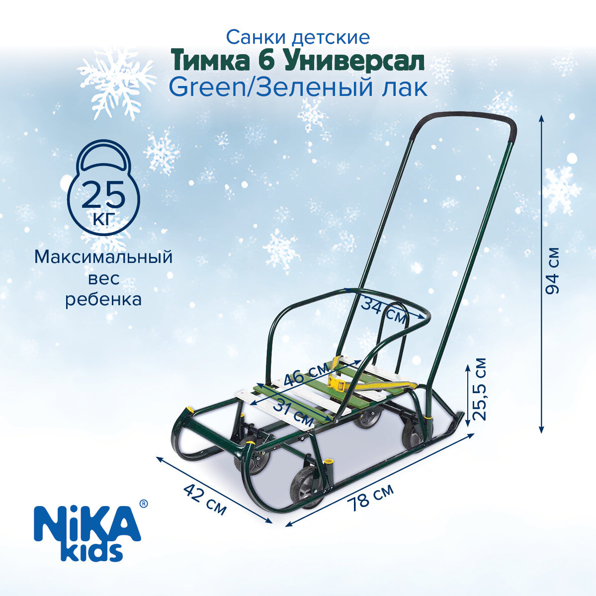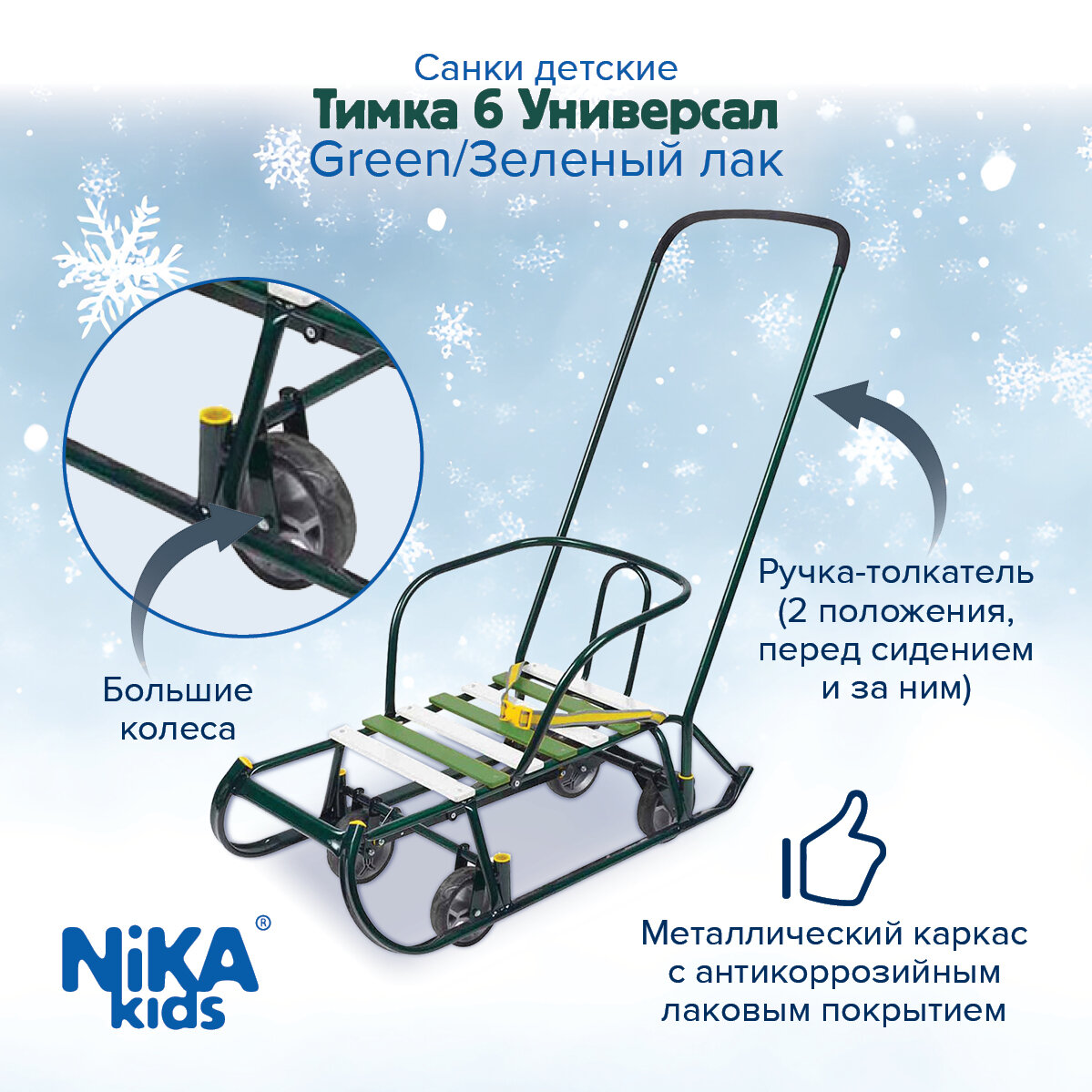Санки детские Nika с колесами Тимка 6 Универсал, зелёный лак. Т6У