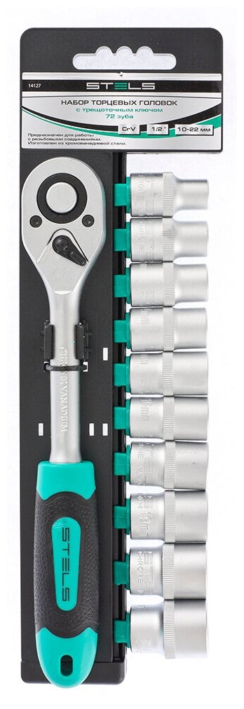 Набор торцевых головок, 1/2, головки 10-22 мм, с трещоточным ключом, CrV, 11 предметов Stels ( 14127 )