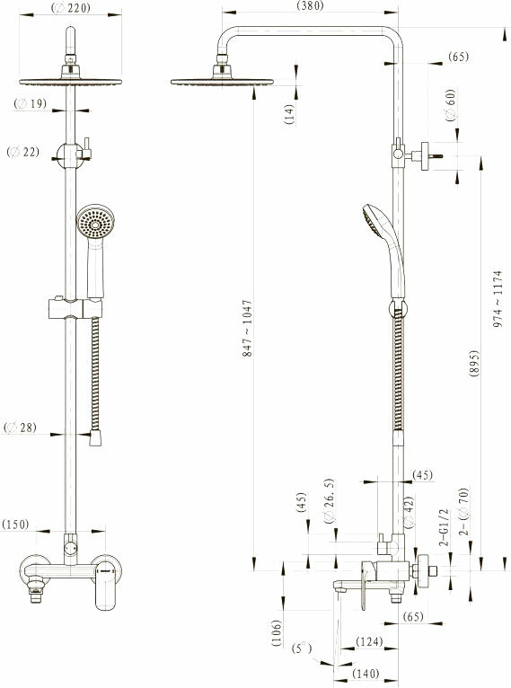 | Дополнительная информация | высота стойки для душа: 1174 мм; диаметр душевой лейки: 80 мм; диаметр верхнего душа: 200 мм |
