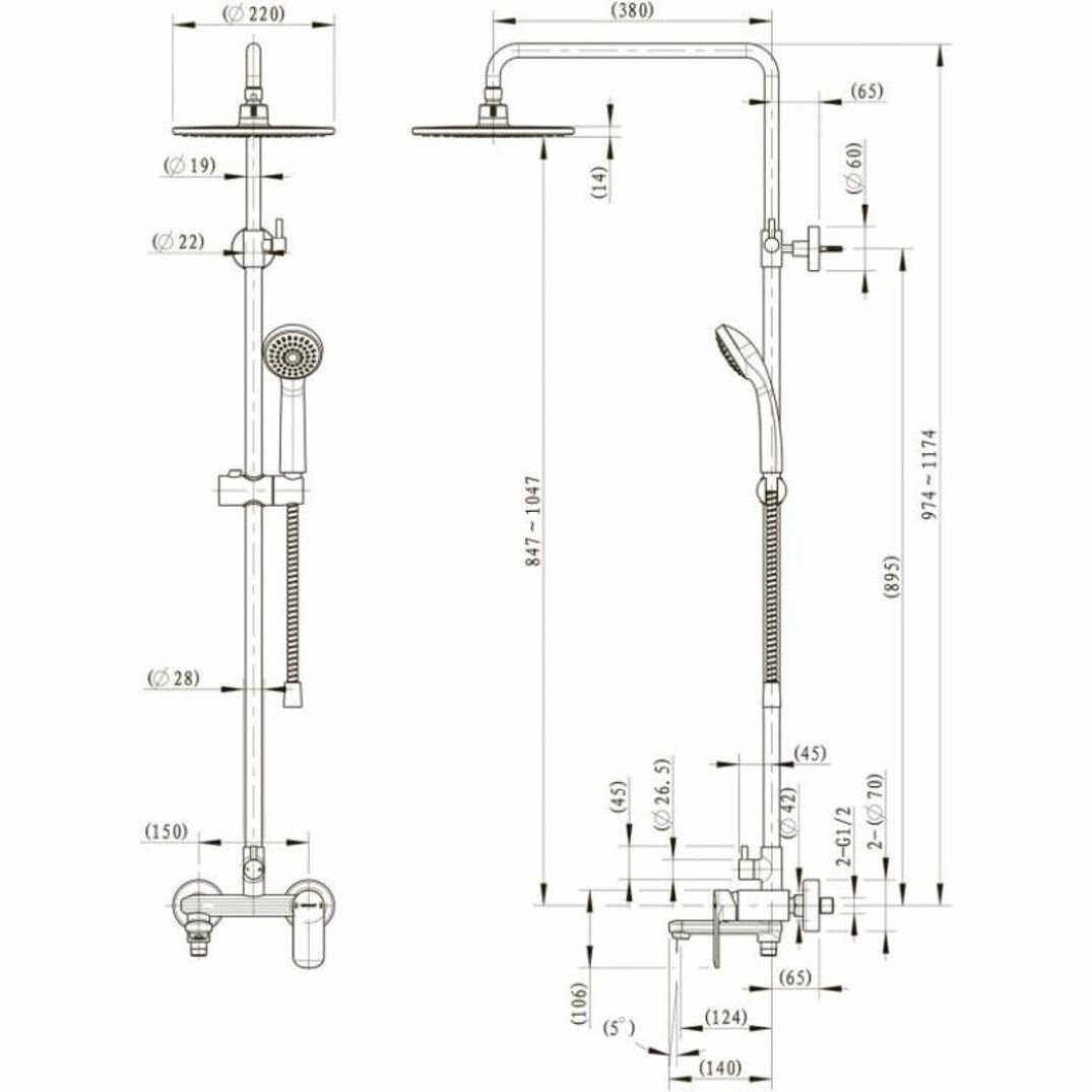 | Дополнительная информация | высота стойки для душа: 1174 мм; диаметр душевой лейки: 80 мм; диаметр верхнего душа: 200 мм |