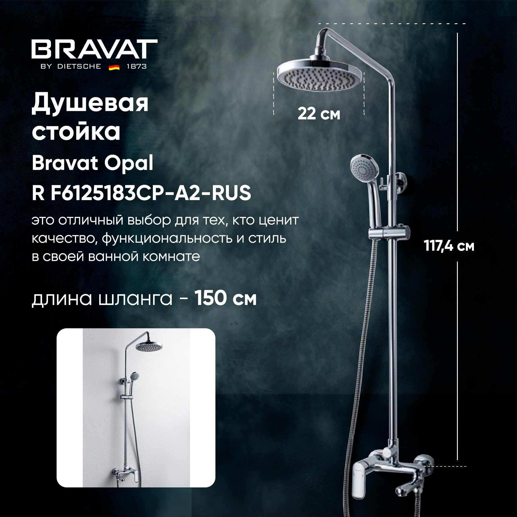 | Дополнительная информация | высота стойки для душа: 1174 мм; диаметр душевой лейки: 80 мм; диаметр верхнего душа: 200 мм |