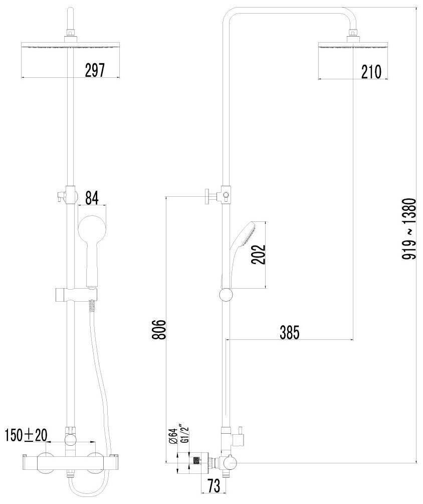| Дополнительная информация | высота стойки для душа: 1380 мм; диаметр душевой лейки: 84 мм; длина верхнего душа: 297 мм; ширина верхнего душа: 210 мм |